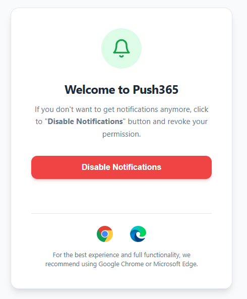 An important point to remember is that Push365 supports a multi-organization architecture. This means you can receive notifications from multiple organizations in the same browser. By using the Unsubscribe button, you are removing your subscription only for the selected organization.